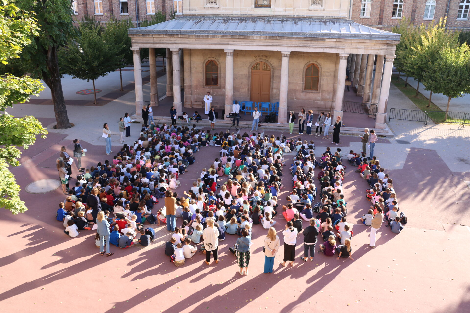 Lundi 8 septembre sur le site de la rue de Prague et mardi 9 septembre sur le site Eugène Napoléon, le Père Stéphane Gravereau est venu bénir les cartables et, surtout, les élèves qui les portent ainsi que leur famille, leurs enseignants et le personnel de l’école.